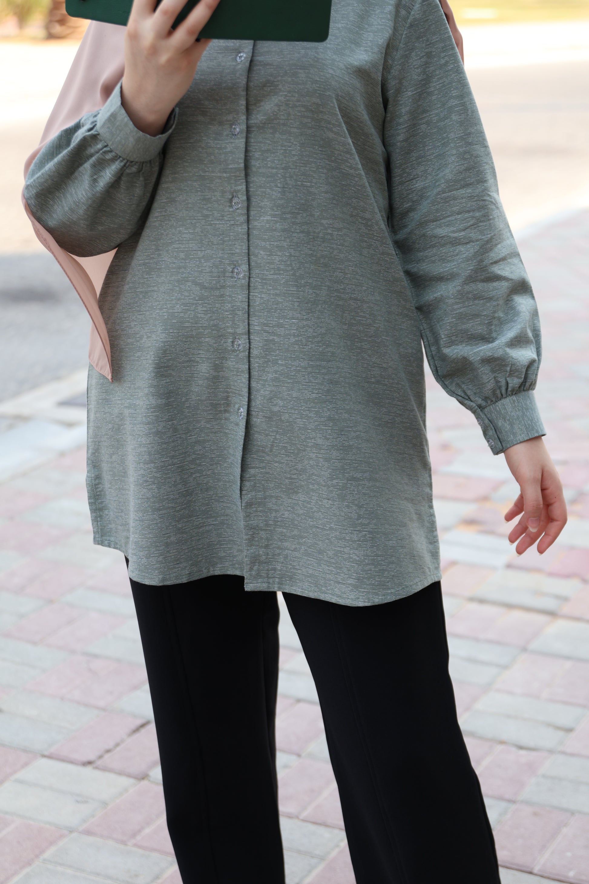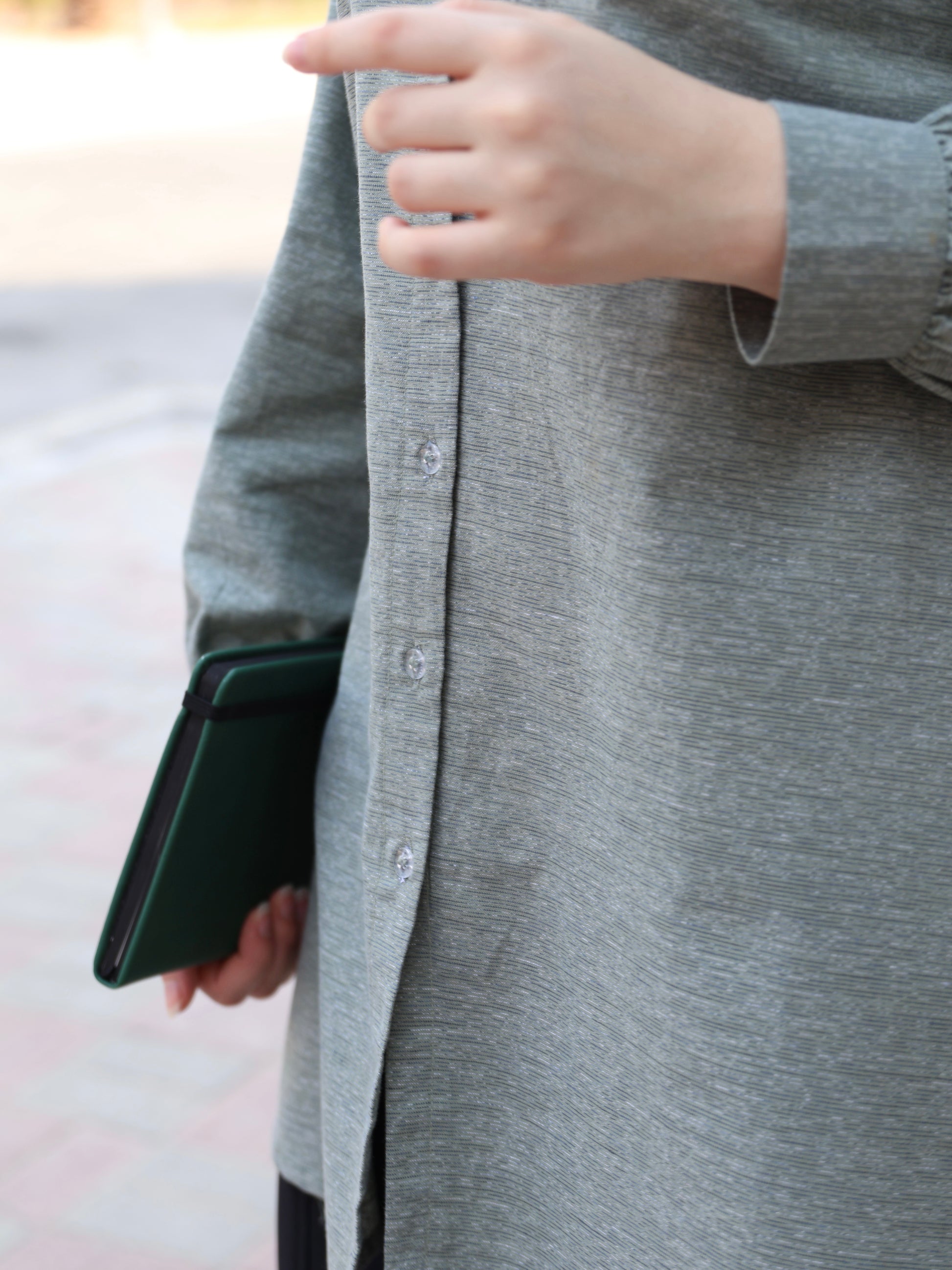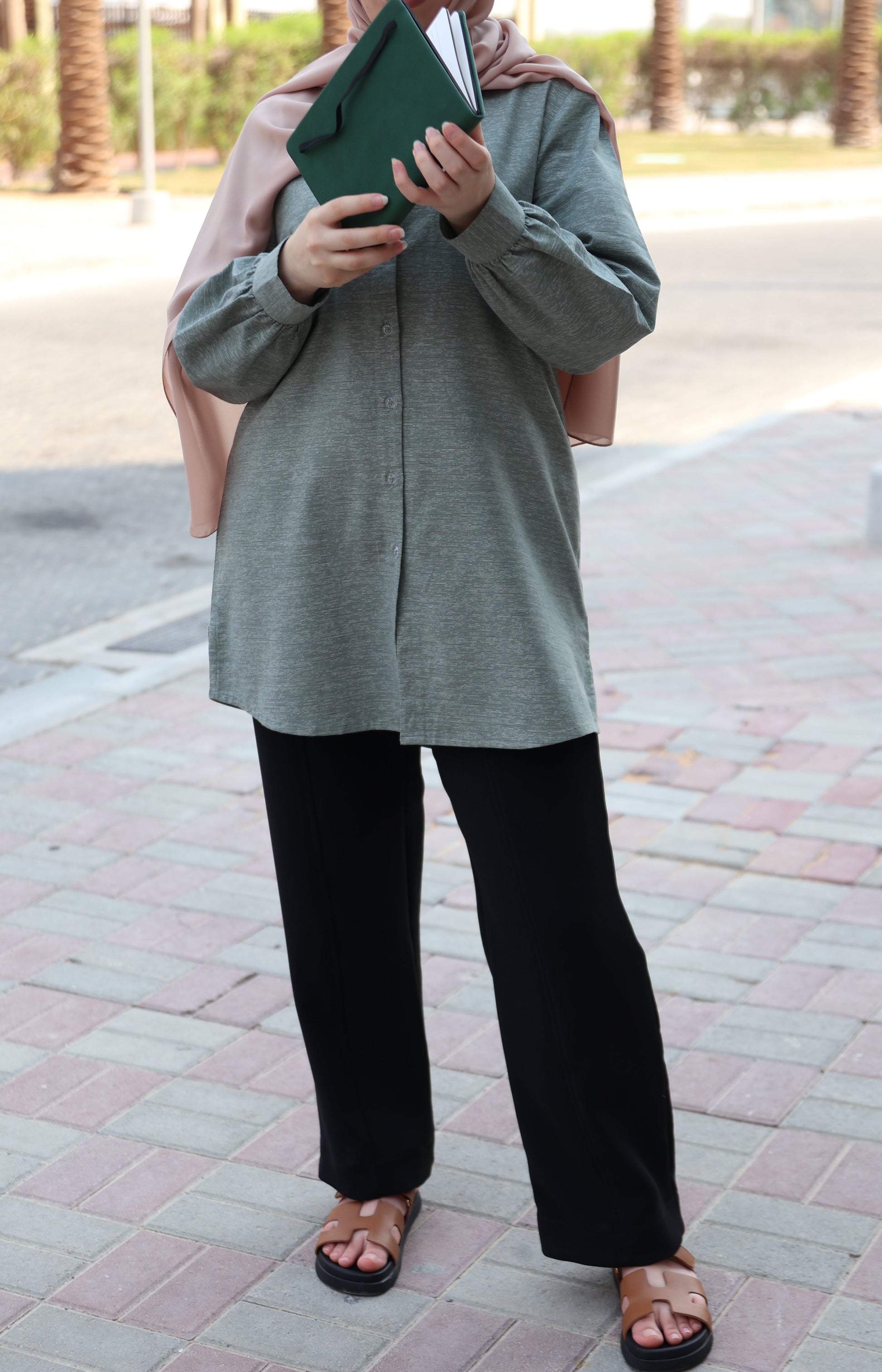The Minimal Sage Set brings together a soft sage green collared shirt and black wide-leg trousers with a front pleat for a relaxed yet polished look you can wear every day, whether at home, out and about, or at a casual office.